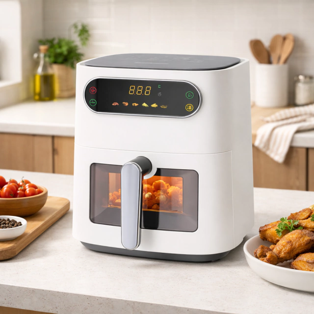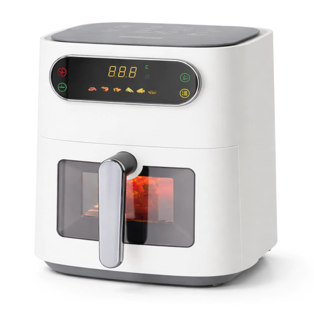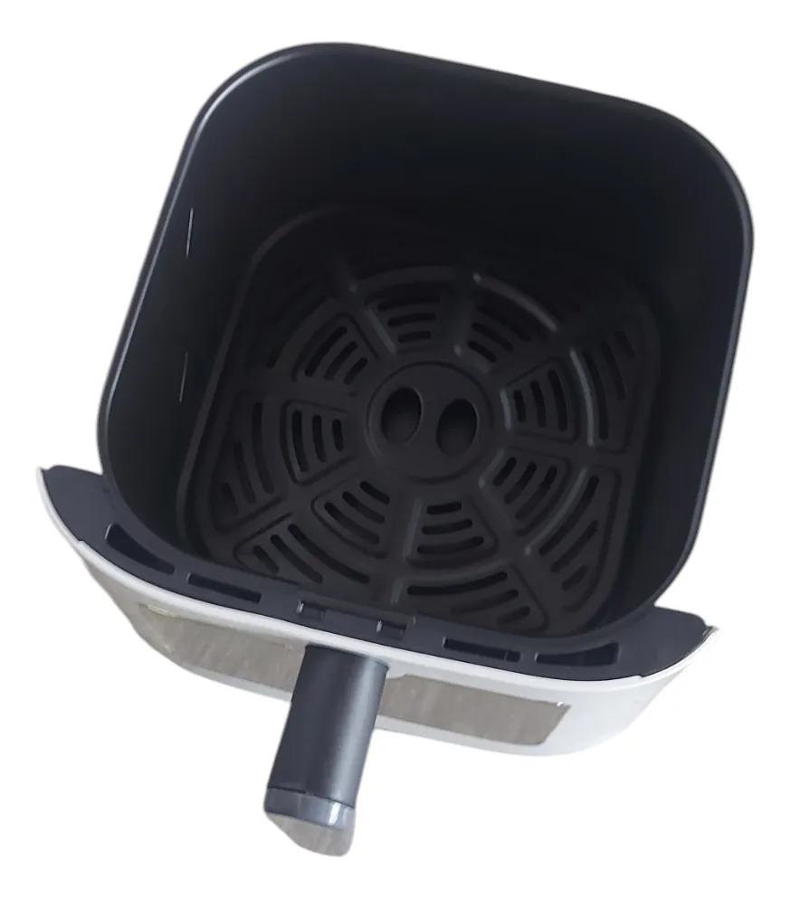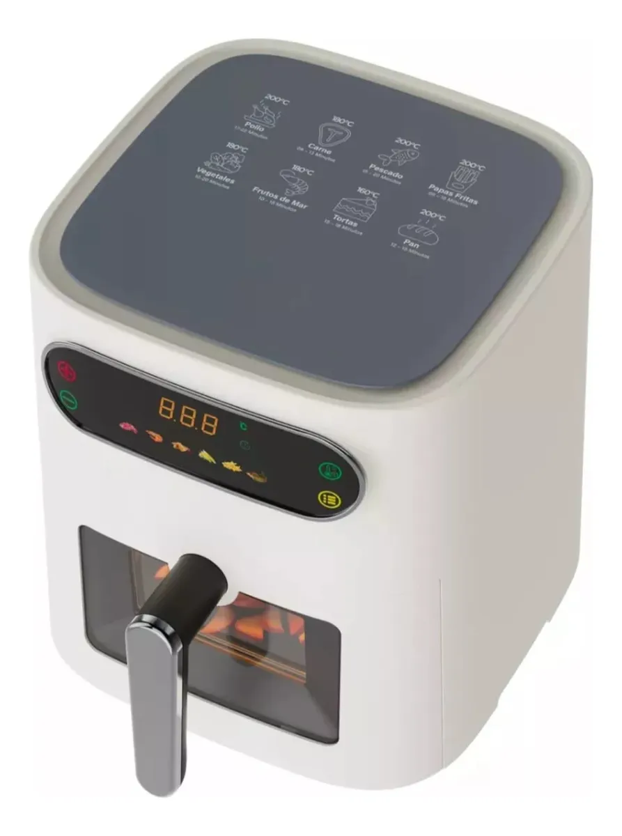 Llevá tu cocina saludable al siguiente nivel. Esta Air Fryer no solo cocina con un 80% menos de grasa, sino que incluye una ventana frontal con luz interna para que puedas controlar el dorado de tus papas o carnes sin abrir la canasta y sin perder calor. Su diseño minimalista en color blanco aporta luminosidad y elegancia a tu mesada.