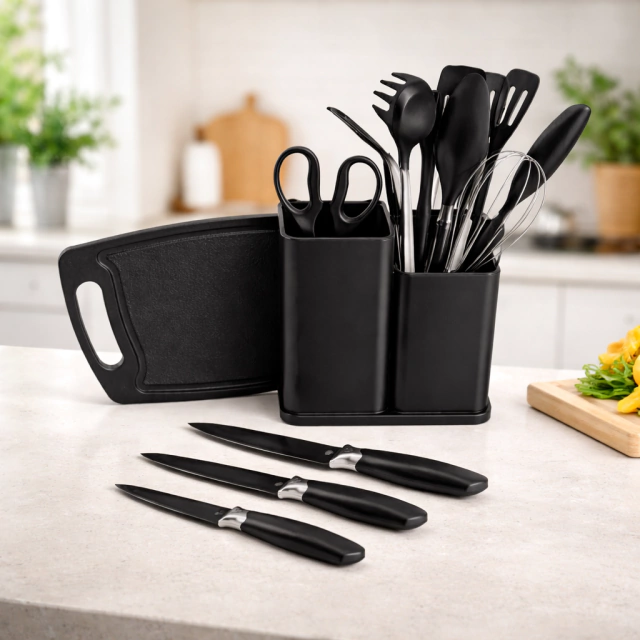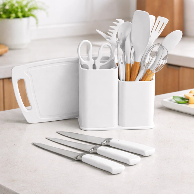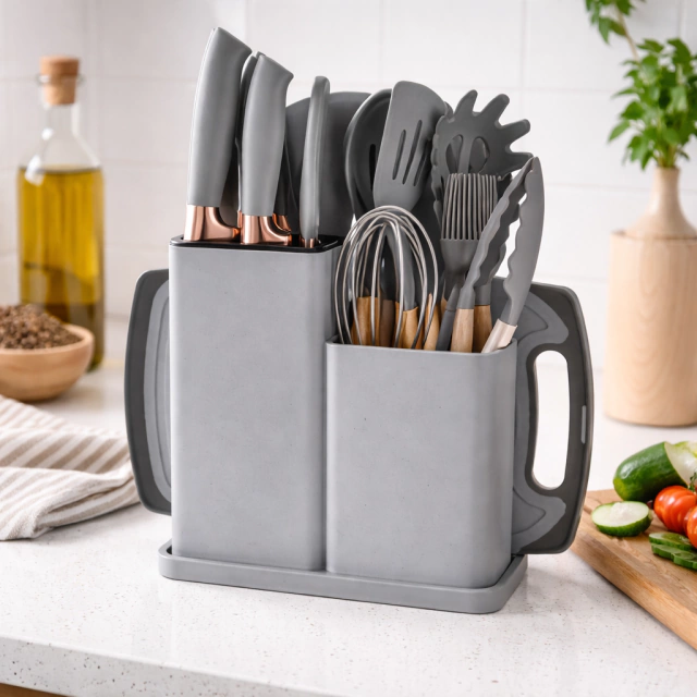 El conjunto incorpora una base organizadora, que mantiene todos los utensilios ordenados y al alcance, aportando funcionalidad y estilo a tu cocina. Disponible en varios colores para adaptarse a tu espacio.